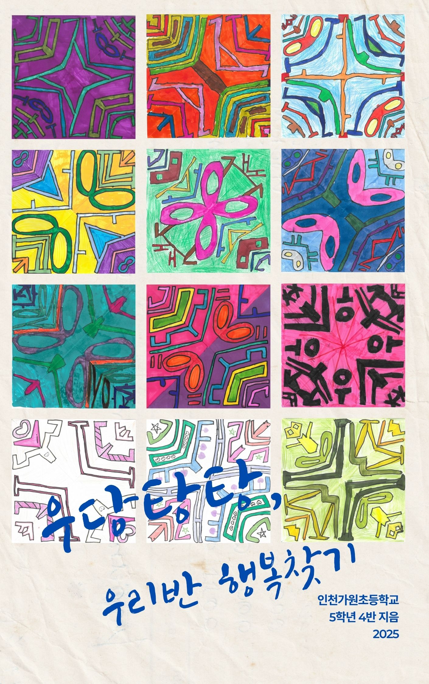 행복을 주제로 1년 동안 했던 활동, 글, 작품들을 모아 잡지처럼 만들었습니다. 앞뒤 표지의 디자인은 학생들의 이름을 대칭으로 표현한 도형 작품을 활용하여 꾸몄습니다.